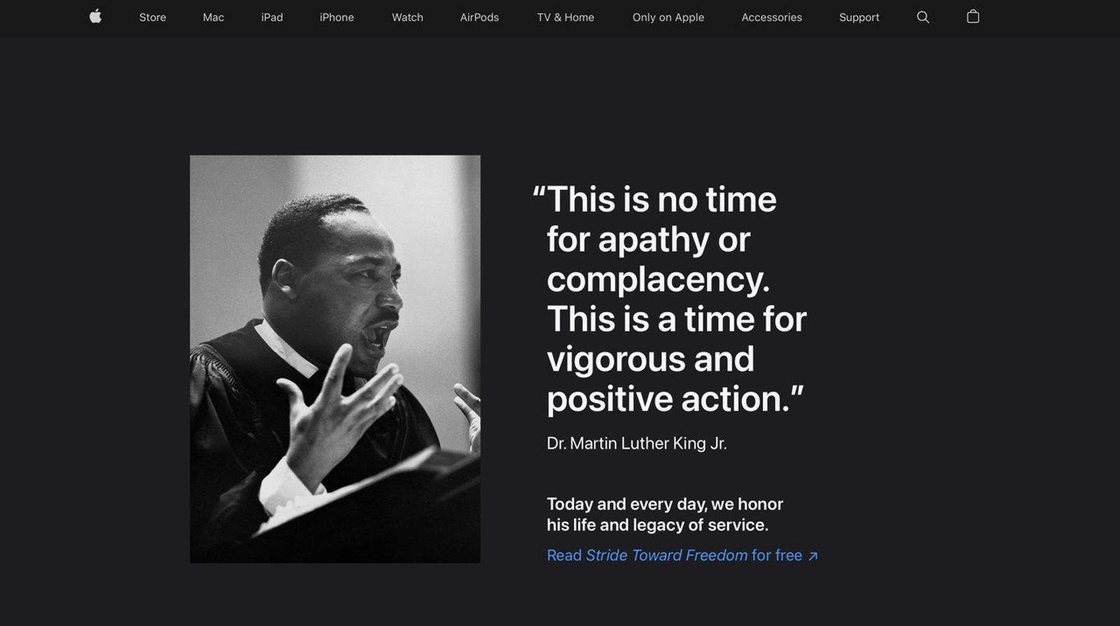 In the words of Martin Luther King Jr., who Apple spotlights every year on its website, "this is no time for apathy or complacency. This is a time for vigorous and positive action."