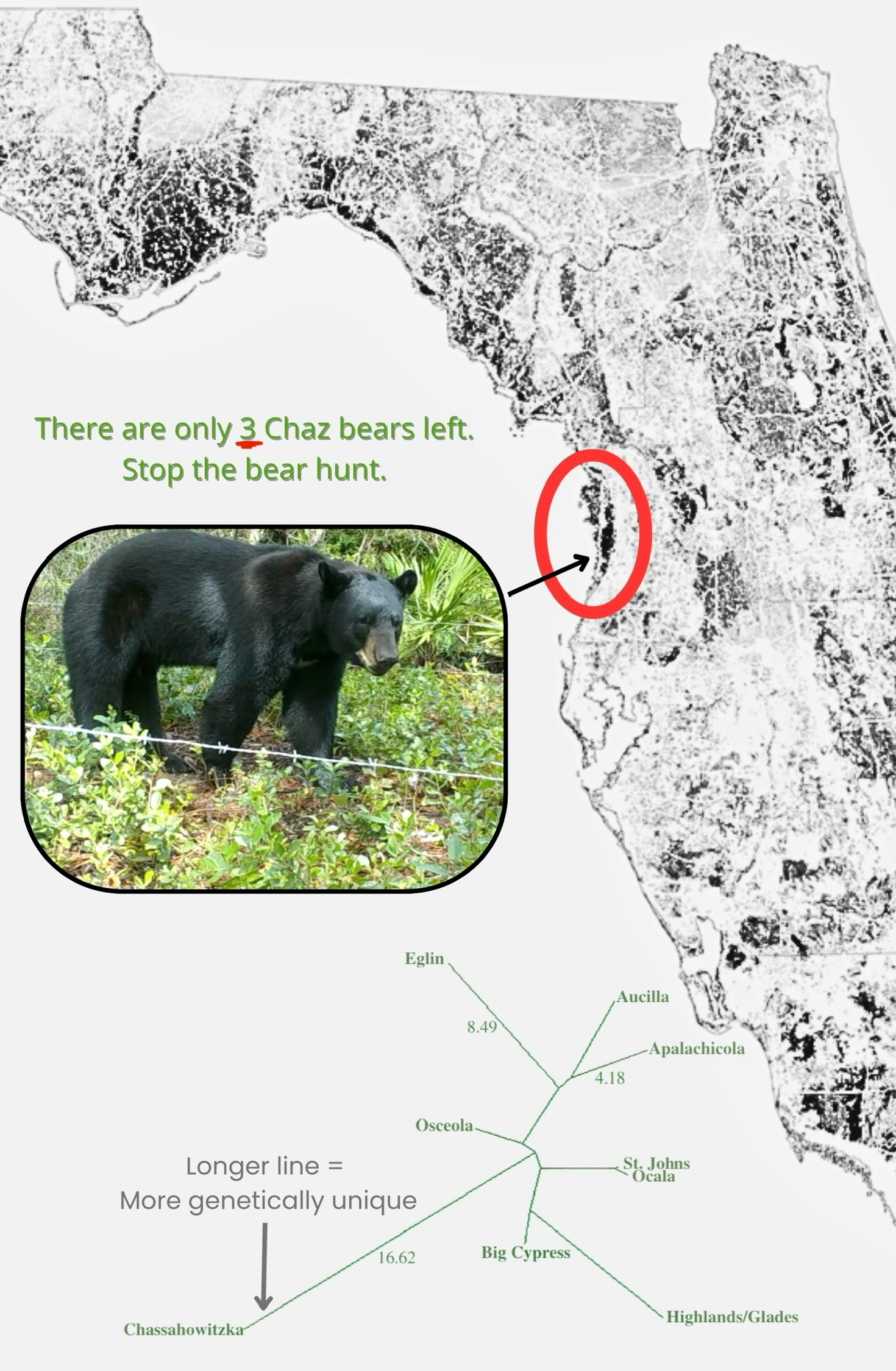 A regional bear hunt, though not targeting the Chassahowitzka subpopulation directly, would harm it indirectly. By reducing bear numbers in adjacent regions, the hunt would also reduce competition, dispersal pressure, and bear movement and migration throughout the state —the very processes that sustain small, local subpopulations like ours. In fact, bears only exist in our region today because of intermixing between Chassahowitzka bears and recent migrants from Ocala: